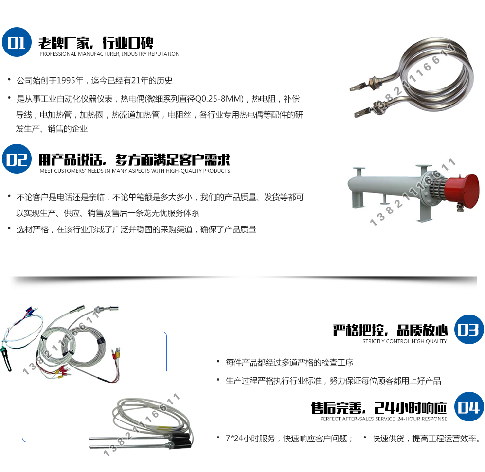 天津昊泰電熱元器件有限公司始創(chuàng)于1995年,迄今已經(jīng)有18年的歷史,是專(zhuān)業(yè)從事工業(yè)自動(dòng)化儀器儀表,熱電偶(微細(xì)系列直徑Q0.25-8mm),熱電阻,補(bǔ)償導(dǎo)線(xiàn),電加熱管,加熱圈,熱流道加熱管,電阻絲,各行業(yè)專(zhuān)用熱電偶等配件的研發(fā)、生產(chǎn)、銷(xiāo)售的標(biāo)桿企業(yè)。 我們的產(chǎn)品以“昊泰”為主品牌,可以廣泛用于玻璃、冶金、鋼鐵、石化、水泥,電力,塑料,食品等行業(yè)。產(chǎn)品從選材開(kāi)始就非常的嚴(yán)格,18年的從業(yè)經(jīng)驗(yàn),我們已經(jīng)在該行業(yè)形成了廣泛并穩(wěn)固的優(yōu)質(zhì)采購(gòu)渠道,確保了產(chǎn)品質(zhì)量關(guān)。同時(shí),引進(jìn)的國(guó)外先進(jìn)的生產(chǎn)及檢驗(yàn)設(shè)備,以及擁有的業(yè)界資深的技術(shù)研發(fā)團(tuán)隊(duì),使得生產(chǎn)流程能夠規(guī)范的按照ISO9001:2000國(guó)際質(zhì)量體系標(biāo)準(zhǔn)進(jìn)行,能夠在技藝上精益求精。 天津江蘇商會(huì)五金機(jī)電分會(huì)副會(huì)長(zhǎng),昊泰總經(jīng)理李興旺,一直秉信先做人,再做朋友,再做生意。不論客戶(hù)是電話(huà)還是親臨,不論單筆額是多大多小,我們的產(chǎn)品質(zhì)量、價(jià)格、發(fā)貨等都可以實(shí)現(xiàn)生產(chǎn)、供應(yīng)、銷(xiāo)售及售...